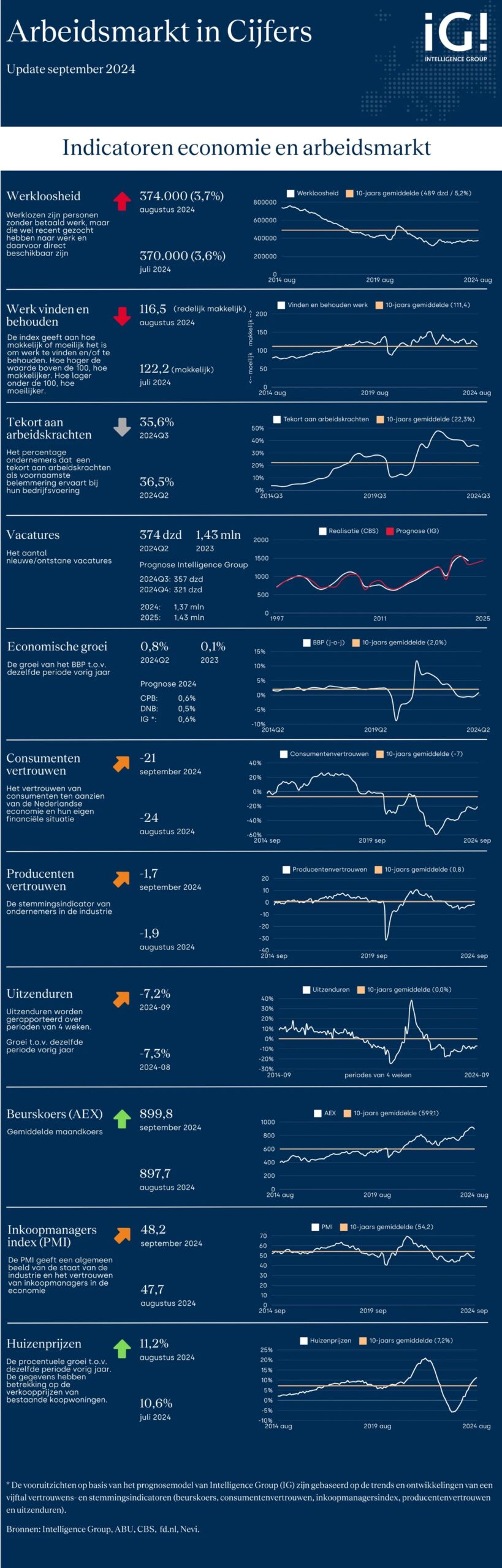 De economie stagneert en veel indicatoren presteren onder hun langjarige trend. De Intelligence Group: “Wel zien we de afgelopen maand lichte verbetering. Zo is het consumentenvertrouwen weliswaar laag, maar het is wel iets toegenomen.” Ook het producentenvertrouwen nam wat toe. Ondernemers in de industrie zijn vooral positief ten aanzien van de verwachte bedrijvigheid/productie in de komende maanden. De deelindicator noteerde de hoogste waarde in bijna drie jaar tijd. Een vergelijkbare ontwikkeling is terug te zien bij de inkoopmanagersindex. In september was de stemming onder inkopers wat minder somber dan in augustus, maar nog altijd staat de index onder de 50 punten, dus krimp. Wereldwijd heeft de industrie het lastig. Voor de meeste grote economieën staat de PMI inmiddels (ruim) onder de 50 punten. Meest in het oog springend is de dramatische situatie in de Duitse industrie. Nog steeds onze belangrijkste handelspartner en de grootste economie van Europa. De Nederlandse industrie doet het wat dat betreft niet eens heel slecht, waarschijnlijk door een relatief sterke vertegenwoordiging van hightechbedrijven zoals ASML, ASMI en NXP die het goed doen door de opkomst van AI.