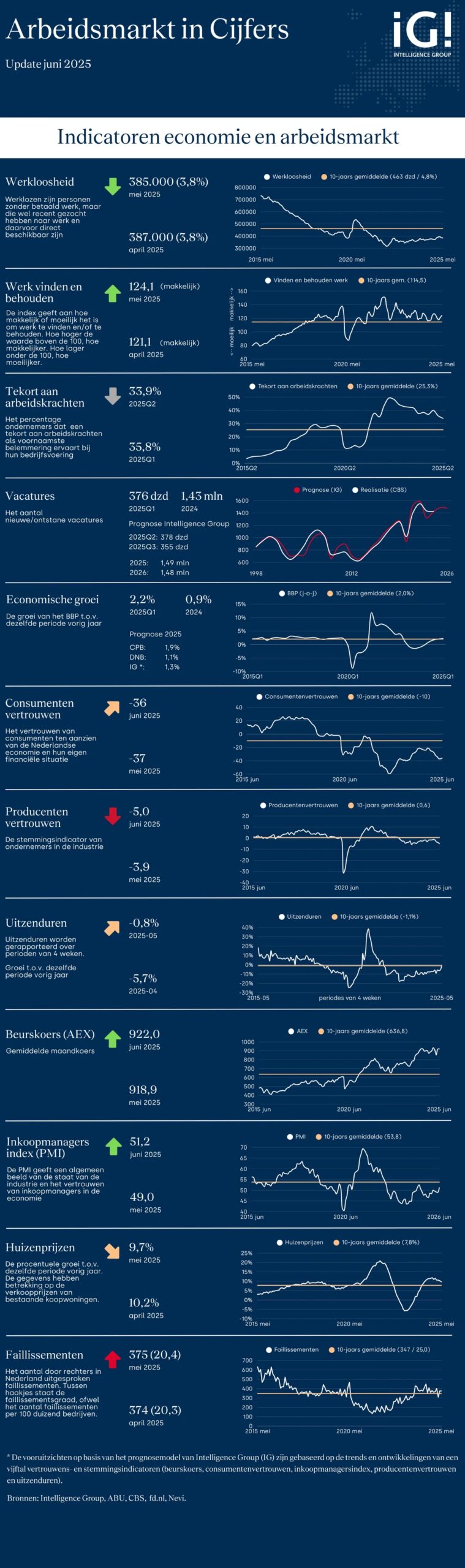 Naar verwachting zullen er dit jaar in totaal 1,5 miljoen nieuwe vacatures ontstaan. Dat is wat meer dan in 2024, maar nog altijd minder dan in recordjaar 2022. De prognose van Intelligence Group is overigens mede gebaseerd op de verwachtingen van het CPB over de economische groei, de werkloosheid en de groei van de werkgelegenheid. De verwachting is op dit moment nog dat de economie dit jaar sterker zal groeien dan vorig jaar. Echter, de ramingen zijn onzeker door bijvoorbeeld geopolitieke spanningen en de handelsoorlog. Zo verlaagde De Nederlandsche Bank onlangs nog haar prognose van de economische groei voor 2025 naar 1,1%. Het UWV gaat in haar meest recente prognose (Arbeidsmarktprognose 2025-2027) overigens ook uit van bijna 1,5 miljoen vacatures in 2025.