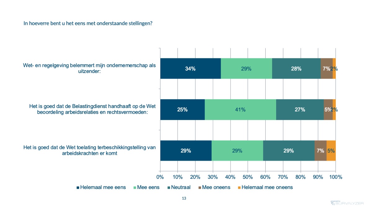 De sector kampt met onzekerheid door veranderende wetgeving, zoals de Wet DBA en de aankomende Wet toelating terbeschikkingstelling van arbeidskrachten (Wtta). Toch is er brede steun voor duidelijke regels: 67,3% van de respondenten steunt actieve handhaving door de Belastingdienst. De behoefte aan transparantie, betrouwbaarheid en een gelijk speelveld is groot.