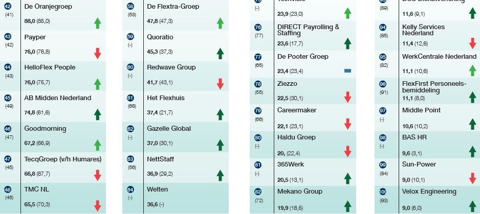 Grosso modo vlakte de groei af in 2019. Dat is ook te merken aan de tegenvallende resultaten van een aantal van de grote groeiers van de afgelopen jaren. In de middenmoot gaat dat op voor ondernemingen als publieke sectorspecialist Driessen (nr. 16, -2,6%), logistieke detacheerder Consolid (nr. 26, -7,8%), mkb-uitzender Staffing Associates (nr. 29, -3,8%) en de techneutendetacheerders Brunel (nr. 19, -6,0%), DPA (nr. 27, -6,0%), TMC (nr. 48, -6,8%), Redwave (nr. 60, -3,1%) en Techsharks (nr. 84, -2,0%). De grote groeimachine van de afgelopen jaren, Timing (nr. 5), boekte nog een omzetplusje van 1,6%.
