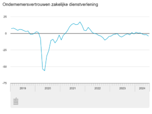 Het ondernemersvertrouwen in de zakelijke dienstverlening daalde aan het begin van het derde kwartaal van 2024 naar -4,1. Een daling ten opzichte van -1,0 aan het begin van het tweede kwartaal. Deze afname in vertrouwen weerspiegelt een bredere onzekerheid in de markt, waarbij ondernemers in de uitzendbranche zich met name zorgen maken over de verwachte omzetontwikkeling.