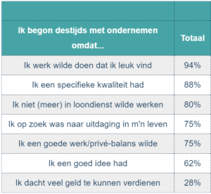 De voornaamste motivatie om een onderneming te starten, blijkt het plezier in werk te zijn. 94% van alle zzp’ers geeft aan dat het verlangen naar leuk werk een belangrijke rol speelde bij hun beslissing om ondernemer te worden. Specifieke persoonlijke kwaliteiten (88%) en de afkeer van werken voor een baas (80%) worden ook vaak genoemd als motivatie.